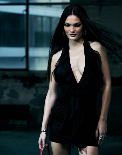 Murci halterneck deep plunge ruffle trim mini dress in black ASOS Very well made.