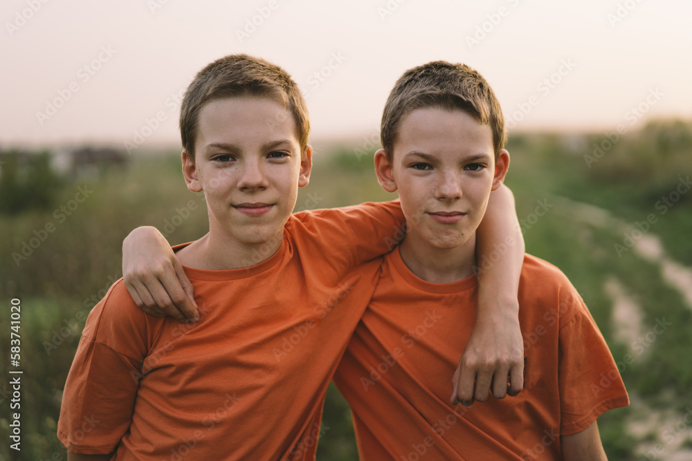 Photo Art Print Funny twin brother boys in orange t shirt playing outdoors on field at sunset Very well made.