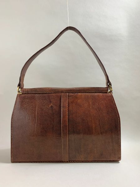 Jane Shilton Dark Tan Lizard Vintage 1950s Handbag With Fabric Lining Mirror Scarf Vintage Handbags shoes clothing Very well made.