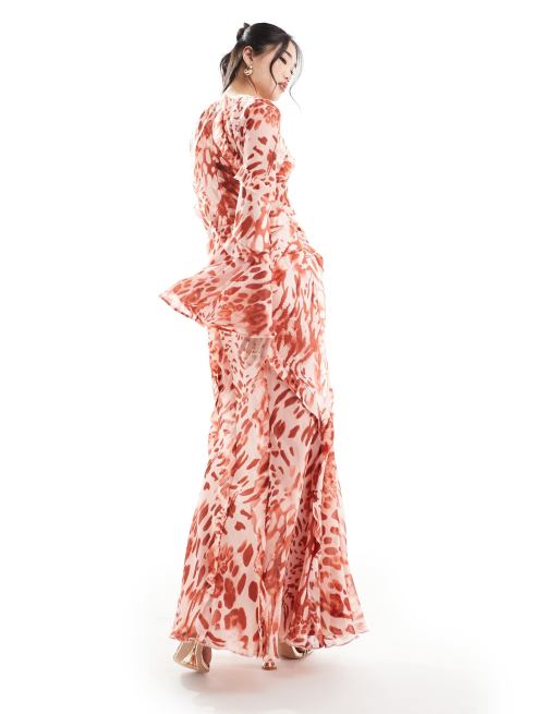ASOS Design Long Sleeve Ruffle Maxi in Satin and Chiffon Mix in Red Animal print Multi Very well made.
