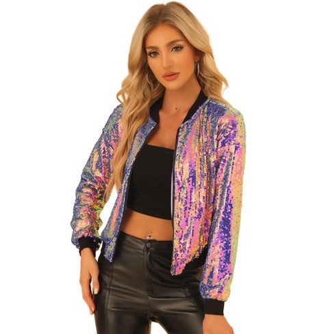 Inspire Chic Women s Party Sequin Sparkle Long Sleeve Cropped Length Zipper Bomber Jacket Multicolor Medium Target Very well made.