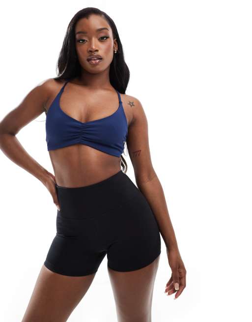 ASOS 4505 Brassiere de sport maintien leger a fronces sur l avant et bretelles dans le dos Bleu marine ASOS Very well made.