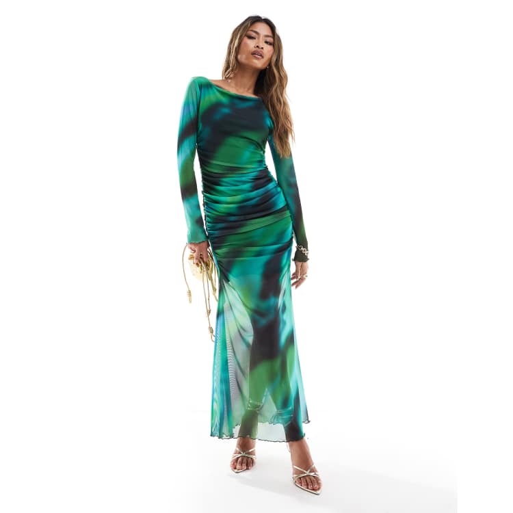 ASOS DESIGN long sleeve mesh midi dress in green smudge print Very well made.