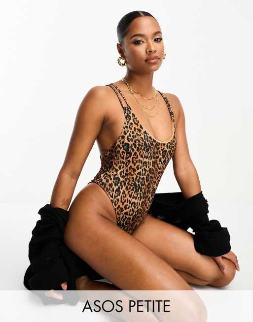 ASOS DESIGN Petite Gerippter Badeanzug mit Leopardenmuster hohem Beinausschnitt und Riemchen in Gitter Optik ASOS Very well made.