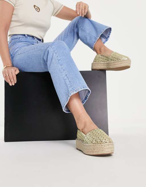 ASOS DESIGN Wide Fit Jala Espadrilles in goldener Weboptik mit Zehenkappen und flacher Plateausohle weite Passform ASOS Very well made.